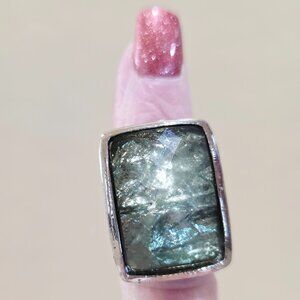 Vintage Green Foil Faceted Acrylic Stone Silver Plate Rectangle Adjustable Ring 7+