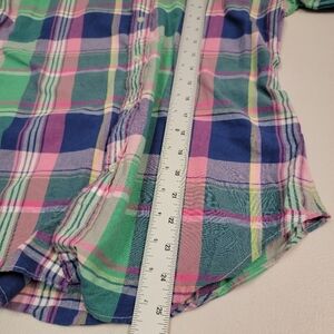 Stylish men's plaid shirt featuring a vibrant mix of green, blue, and pink. Perfect for casual outings or a smart-casual look.