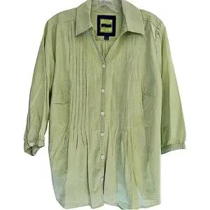 pure and simple, everwear, green gingham blouse, sage green top, light green check shirt, button front blouse, pleated front top, tuck pleat blouse, pintuck shirt, collared blouse, cotton button down, 100% cotton shirt, breathable cotton, lightweight blouse, relaxed fit top, loose fit blouse, three quarter sleeve top, 3/4 sleeve blouse, roll tab sleeves, casual work blouse, teacher style blouse, cottagecore shirt, boho casual top, minimalist blouse, natural fiber clothing, slow fashion style, soft green top, neutral green blouse, spring blouse, fall layering top, wardrobe staple, women’s button up shirt, everyday blouse, comfort fit top