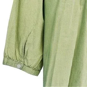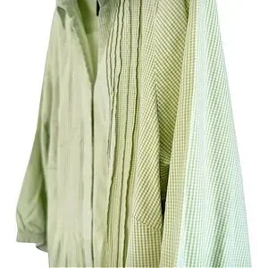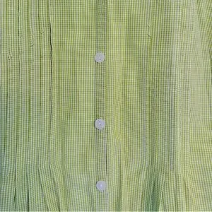 This lightweight Avenue The Pleat Shirt brings effortless comfort and charm to your wardrobe. Designed in a fresh apple green and white micro-gingham check, it features a relaxed silhouette, slightly curved hemline with delicate vertical pleating along the bodice that flatters the shape while adding subtle texture. The button-front closure, pointed collar, and 3/4 sleeves with button cuffs keep it polished, while gentle gathers below the waist offer an easy, flowy drape.