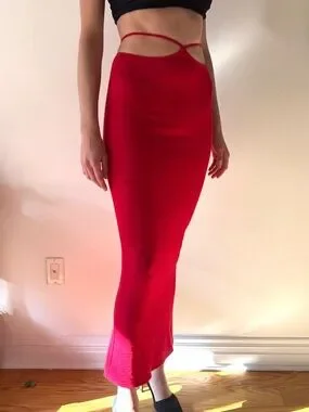 Size small, Red, wrap bodycon skirt, model is 6’0”