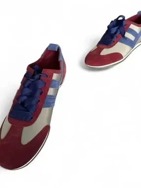Features: Low-top style, textile base, suede overlays, pull tab, two-tone rubber outsole, woven ribbon laces, tongue loop with court motif
