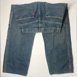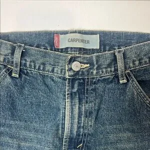 Slim straight cut with carpenter pocket details. Five-pocket styling with utility loop. Faded wash, perfect for everyday wear.