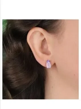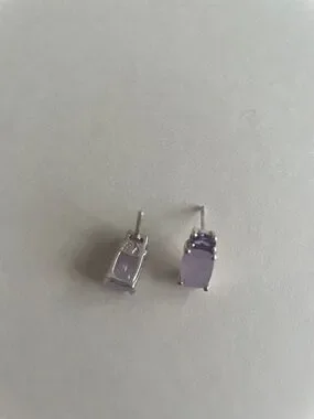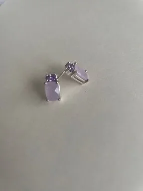 Gemstones: The earrings feature a double-stone design with a larger rectangular or "radiant-cut" bottom stone and a smaller square or rectangular top stone. Given the color and common pairings for sterling silver, these are likely purple quartz & purple cubic zirconia.