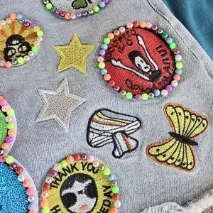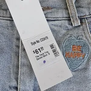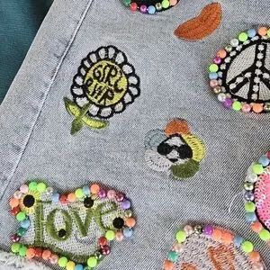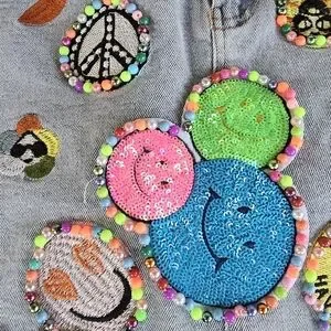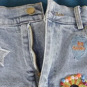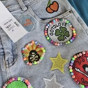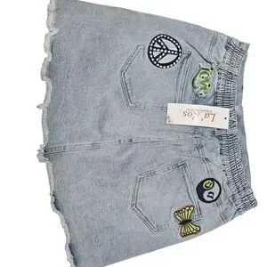 Add a splash of color to your outfit with this vibrant embellished denim skirt. Featuring playful patches, it's perfect for a fun and unique look. Measured 27 1/2 inches in waist and 14 inches in length. The back does have stretchy material in the waist line for various size fits.