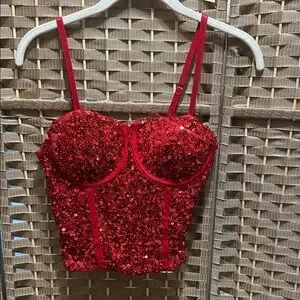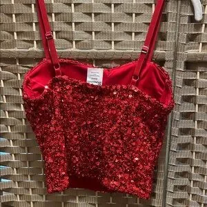 Sparkling red sequin bustier crop top with adjustable spaghetti straps. Structured cups with light boning for shape. Allover sequins create bold, party-ready shine.