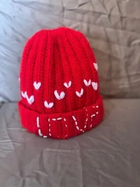 Soft red knit beanie designed for anyone. Features white heart accents and a stitched LOVE detail for playful style. Comfortable, cozy fit for everyday wear. Easy to pair with casual outfits. Made with 100% acrylic yarn