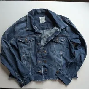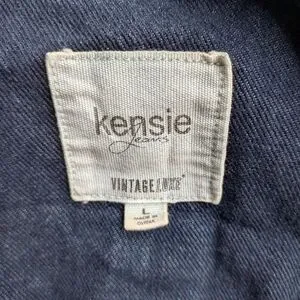 Classic Kensie jean jacket in medium blue denim. Button-front closure with chest flap pockets. Panel stitching and slight distressed hem. Casual versatile layering piece.