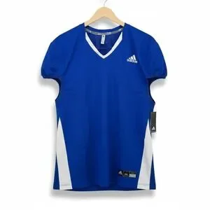 Keywords: adidas football, athletic wear, sports jersey, royal blue, v-neck, short sleeve, menswear, training gear, game day, performance top, team apparel