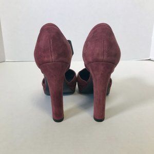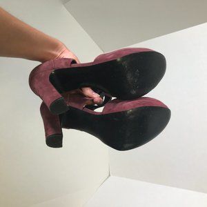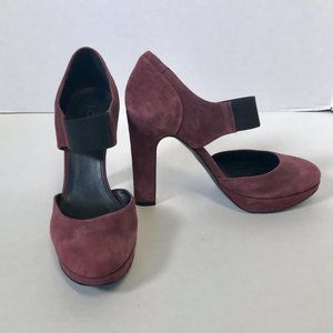Mary Janes are trending to hard in 2025! J. Crew suede maroon pumps w black elastic strap. Chunky 4.5 inch heel with 1" platform. Fab for Everyday, Work, Party Night Out. Super chic, retro cool, and only worn a couple times. Made in Italy of luxury suede leather. EUC.