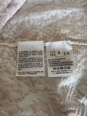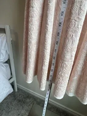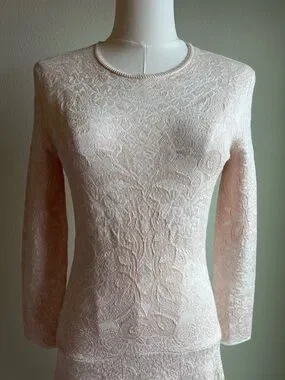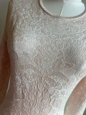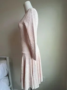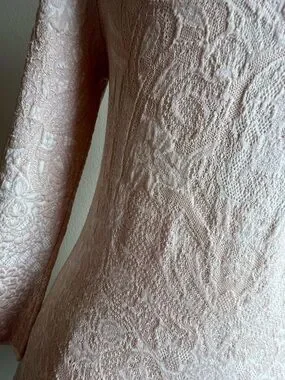 Delicate lace mini dress with a fitted bodice and flared skirt. Long sleeves and crew neckline. Intricate floral lace texture throughout. Soft pale blush hue for a feminine look. Ideal for elegant daytime or evening wear.