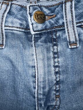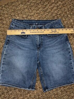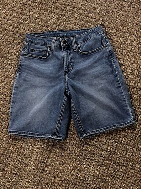 Casual women's jean shorts by Riders by Lee. Mid blue denim with subtle fading. Five-pocket style with belt loops. Zip fly and button closure. Versatile everyday piece for warm weather. Good lightly worn condition.