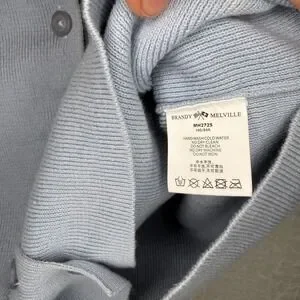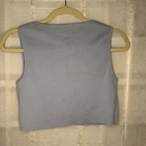 Brandy Melville button-front sweater vest in a soft light blue. This cropped, sleeveless knit features a scoop neckline and a full button closure, perfect for layering or wearing on its own. While the overall structure is in great shape, there are some light bleach-like spots or discoloration along the interior hem as shown in the photos. Please reference all photos for detailed measurements and condition. This versatile piece is ideal for school days, casual coffee dates, or a weekend brunch.