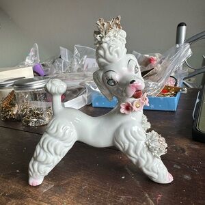 Charming vintage brand ceramic poodle. Glossy white finish with soft pink details on paws, nose, and collar flowers. Delicate floral collar and textured fur design. Decorative tabletop accent. Cute and whimsical style.