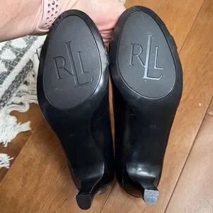 Keywords: Ralph Lauren, black pumps, leather heels, block heel, buckle shoes, dress shoes, work heels, office shoes, evening shoes, classic, sophisticated, women's footwear, designer heels