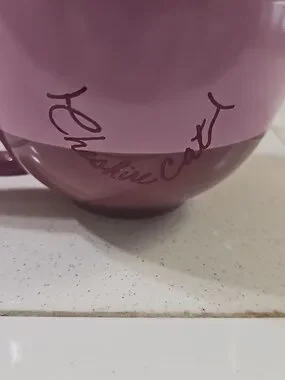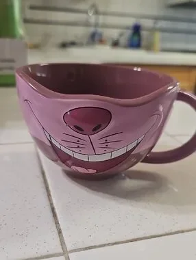 Playful ceramic mug with a smiling Cheshire Cat face. Glossy pink finish. Comfortable handle and wide bowl shape. Cute whimsical design perfect for collectors or gifts.