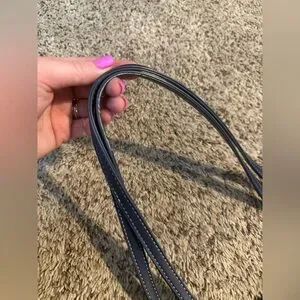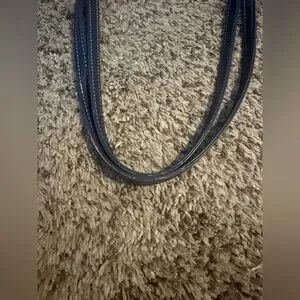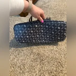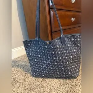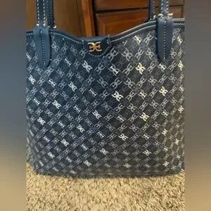 Sam Edelman Harper Monogram Medium Shopper Tote bag in navy blue coated canvas.