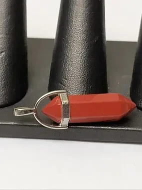 Bold red double-point crystal pendant with silver-tone cap and bail. Clean geometric shape. Simple statement charm for necklaces or chains.
