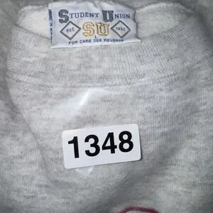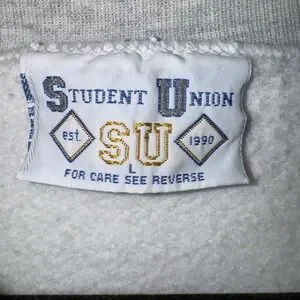 Tag details: Woven Student Union SU neck label with 'est. 1990' graphics and size L notation, plus separate white care/content tag showing 50% cotton 50% polyester composition and machine wash instructions.