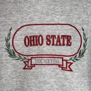 Item: Mens crewneck sweatshirt with front 'Ohio State' text framed by laurel branches and 'Buckeyes' banner embroidery across the chest.