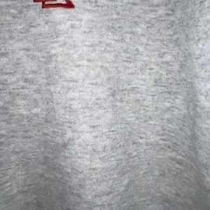 Color: Heather gray body with red and green front stitched collegiate design; solid gray back.