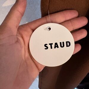STAUD trench coat in rich brown. Long silhouette with classic notched lapels.
