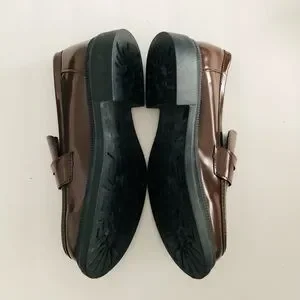 Patent leather brown loafers from with a classic penny strap. Durable synthetic leather upper with a comfortable cushioned insole. Versatile brown color perfect for smart-casual and office looks.