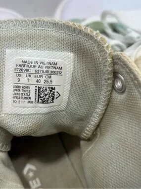 Converse high top canvas sneakers. Soft sage green fading to cream on the upper. White laces and white platform sole. Round Converse All Star ankle patch. Classic eyelets and rubber midsole.