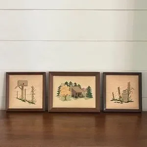 Vintage Framed 3-piece Cross-stitch Needlework Cabincore Cottagecore Country Farmhouse Wall Art Decor. Brown Coordinating Frames. Lovely vintage look with natural color faded cream of background fabric and a bit of gentle wear of time on frames. Lovely set!