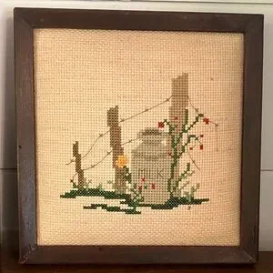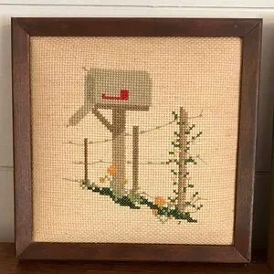 Piece 3: @7x7” Frame, Mailbox with flowers by fence Cross-stitched design.