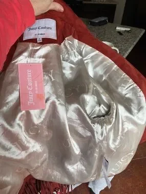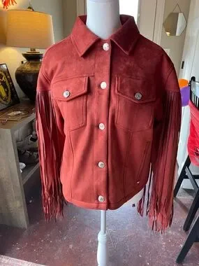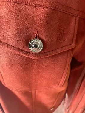 Stylish Juicy Couture leather jacket with long fringe detailing. Rich rust red color and smooth suede finish. Front pockets and metal snap buttons. Western-inspired, fashion-forward look.
