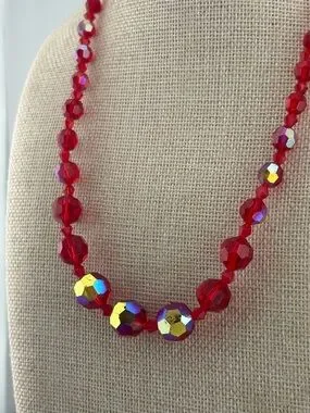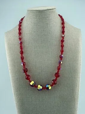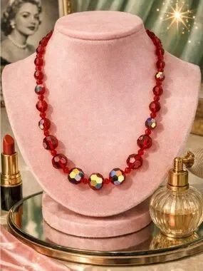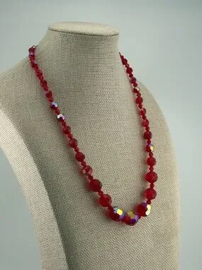 Turn heads with this dazzling vintage-inspired crystal necklace featuring rich ruby red faceted beads accented with radiant Aurora Borealis crystals that flash brilliant rainbow hues with every movement. The graduated design creates a classic silhouette, while the larger AB crystals at the center add a stunning focal point.