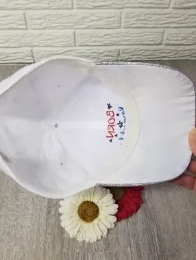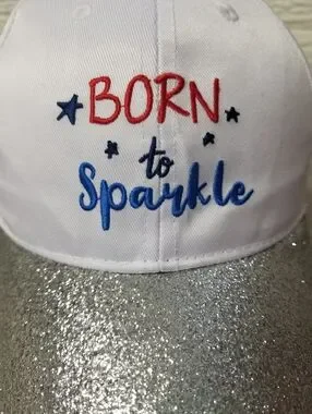 This is a fun Americana baseball cap featuring embroidered "born to sparkle" in red and blue and a glittery silver rim. Adjustable with velcro for perfect fit. Perfect for a Summer barbecue! Like new condition