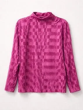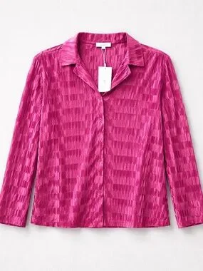 Vibrant fuchsia pink button-down shirt with a subtle textured check pattern. Classic collar and long sleeves create a polished, easy-to-wear silhouette. Lightweight drape for comfortable all-day wear. Pairs smoothly with tailored pants or denim for versatile styling.