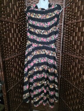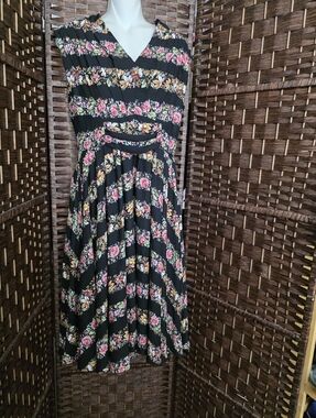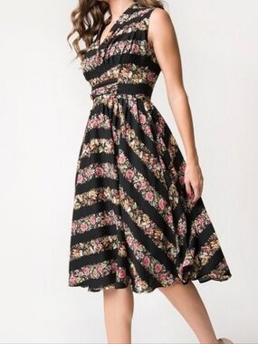 Unique vintage Floral Stripe Sleeveless Midi Dress in Black and Pink