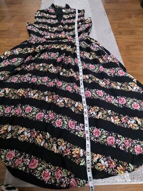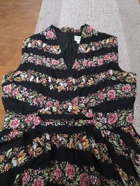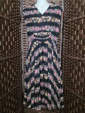 unique vintage1950s Style Black & Striped Floral Chiffon De Carlo Swing Dress more detail in pic
