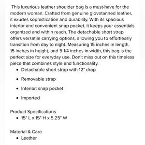 This luxurious leather shoulder bag is a must-have for the modern woman. Crafted from genuine glovetanned leather, it exudes sophistication and durability. With its spacious interior and convenient snap pocket, it keeps your essentials organized and within reach. The detachable short strap offers versatile carrying options, allowing you to effortlessly transition from day to night. Measuring 15 inches in length, 15 inches in height, and 5 1/4 inches in width, this bag is the perfect size for everyday use. Don't miss out on this timeless piece that combines style and functionality.
