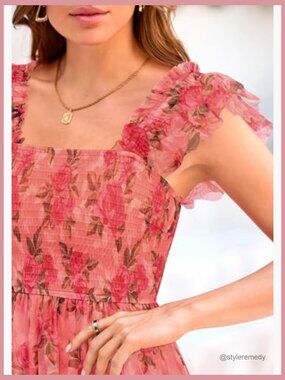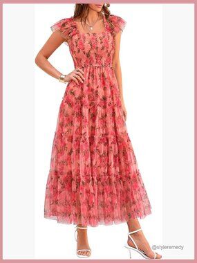A delicate, tiered dress designed for comfortable elegance at a party, as a wedding guest, or during daily summer activities. Features a smocked design for a flattering shape and lightweight fabric for easy movement, making it a versatile piece for warm weather.