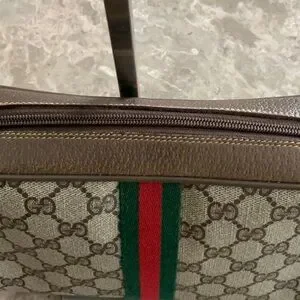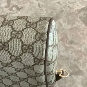 This elegant Gucci messenger bag showcases the iconic GG monogram in a sophisticated cream and brown color palette.