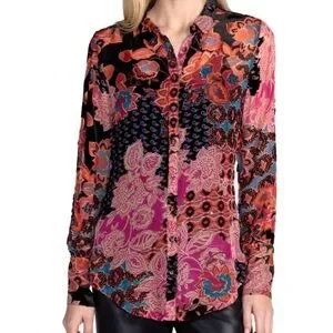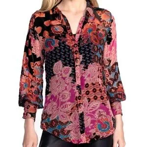 The Yrene Burnout Blouse is embellished with a vibrant pattern in a kaleidoscope of color. Designed with a classic collared button-front, this unique slip-lined blouse is finished with a curved hemline and wide cuffs for a tailored look. Pair with a sleek pencil skirt and pumps for an elevated work ensemble or jeans and boots for an upscale casual look. Gorgeous and versatile!
