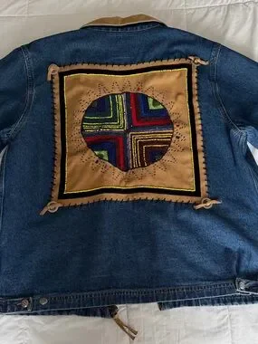 A sturdy dark blue denim jacket with a contrasting tan corduroy collar. Clean, classic silhouette for everyday layering. Front pockets and a practical zip closure for easy wear. Versatile piece that pairs well with casual outfits. Barely worn - in pristine condition. Color: dark blue with tan collar. Brand: Don’t Mess With Texas