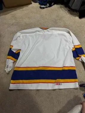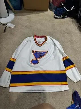 Vintage 90s St. Louis Blues CCM NHL Hockey Jersey, White/Blue/Yellow, Size XL — Made in Canada.