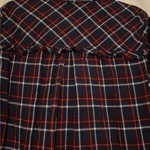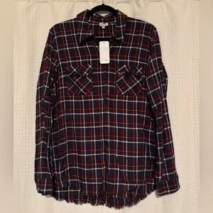 This is a women's long sleeve plaid flannel shirt. It features a red, navy blue, and white plaid pattern, a collared neckline, button-up front, two chest pockets with frayed edges, and a frayed hemline.