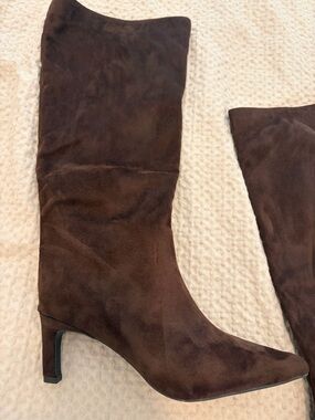 Stylish brown knee-high suede boots with a pointed toe and slim mid heel. Comfortable and versatile for day-to-night wear. Soft suede upper provides a refined, classic look.