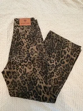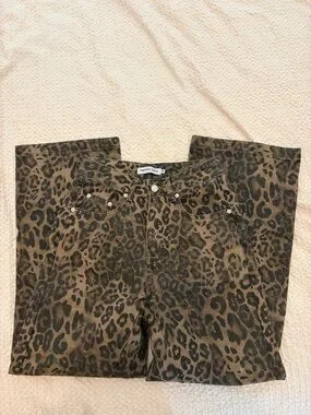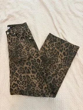 High-rise flare jeans with bold leopard print. Structured denim with classic five-pocket styling. Sleek silhouette that flatters the leg. Versatile piece for casual or elevated looks.