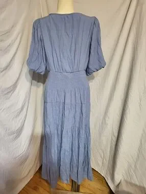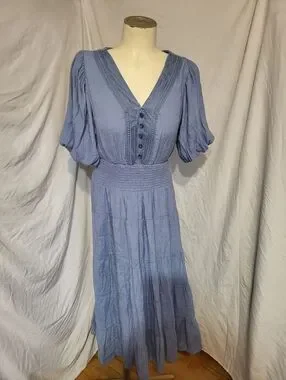 Kings Road Blue V-Neck Puff Sleeve Maxi Dress with Smocked Waist, Size Large