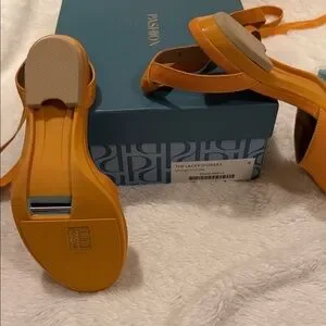 Pashion orange tie-up convertible flat sandals with ankle ribbons. Soft fabric upper offers a secure, comfortable fit. Versatile style pairs with dresses and casual outfits. Lightweight design for all-day wear. No heel blocks.