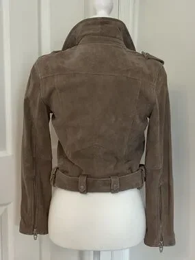 Cropped Suede Moto Jacket With Knotched Collar, Self Belt and Metal Hardware