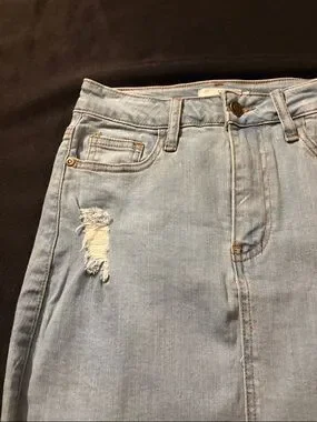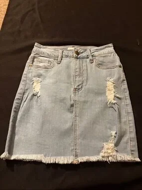 Casual light blue denim mini skirt. Features distressed patches and frayed hem. Classic five-pocket styling with belt loops. Clean, versatile look for everyday wear.