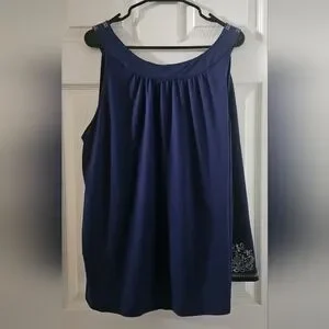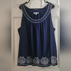 Pretty navy-blue sleeveless top with contrasting white Scandinavian style embordery about the round neckline and the front hemline. Lightweight with a mild flared hemline, all-way stretch fabric made from 60% breathable cotton and 40% Modal material. Excellent condition🌻